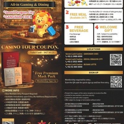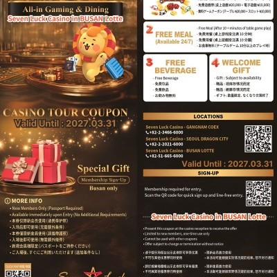 對於來韓國的國際訪客,特別提醒您通過Trippose.com與七樂娛樂場(SEVEN LUCK CASINO - South Korea)的合作,享有專為外國人準備的獨家優惠券。請務必利用這些獨特的福利和服務,享受您在韓國的七樂娛樂場的美好時光!