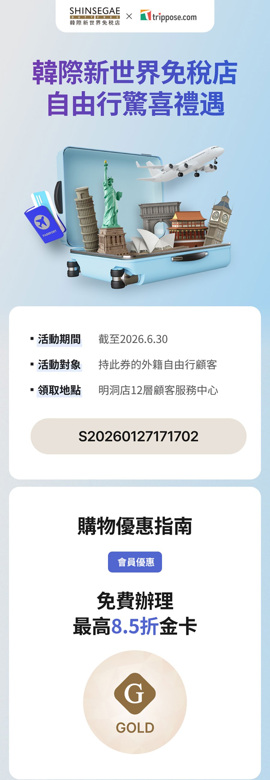 黃金會員:最高可享 15% 折扣 + 消費滿 $50 立減 1萬韓元 + 入店禮品優惠券