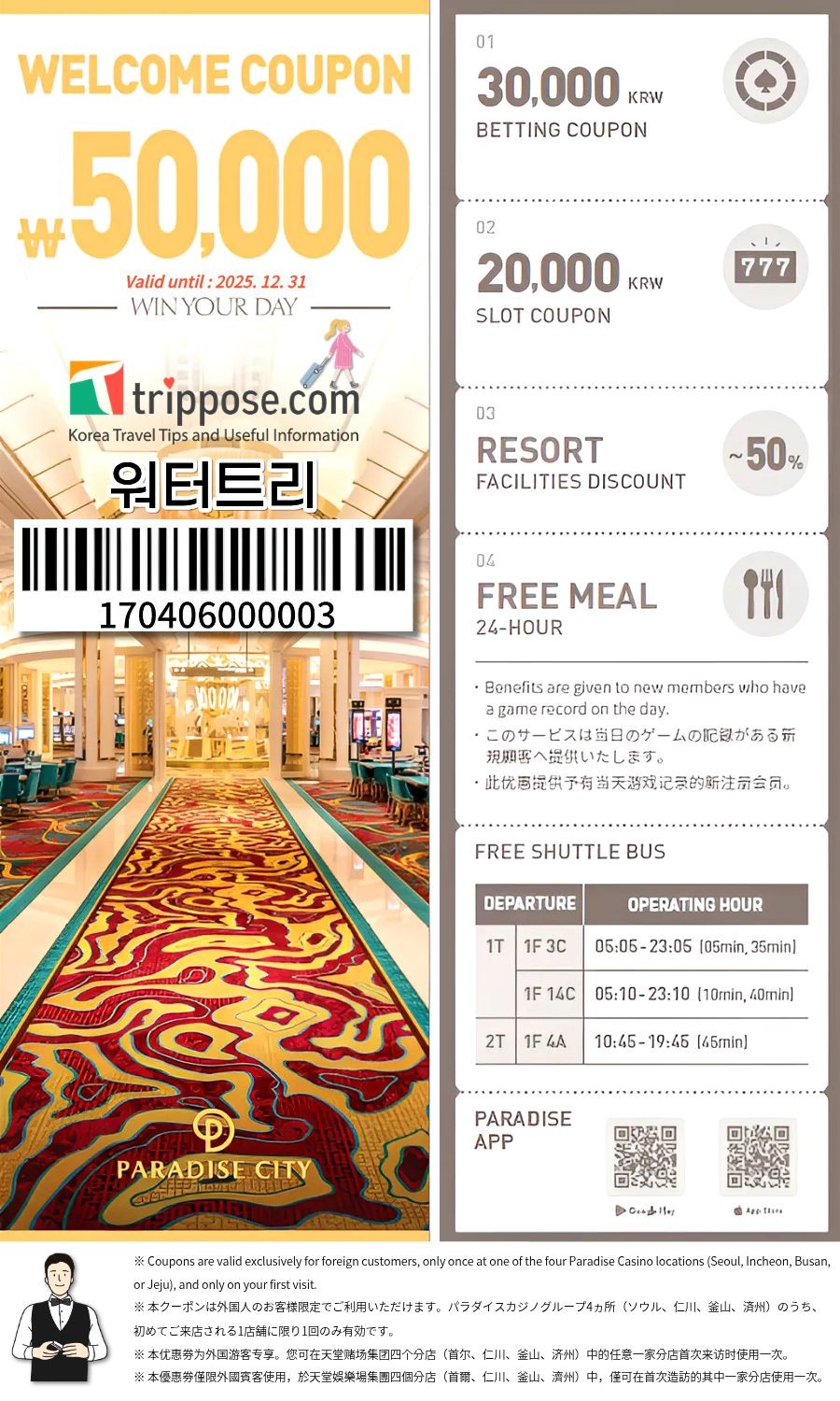 韓國最具象徵意義的百樂達斯娛樂場 (PARADISE CASINO) 邀請您共享前所未有的奢華之旅。我們誠摯地邀請您加入這場豐富多彩的娛樂盛宴。現在,您只需在 "Trippose.com" 使用我們的專屬優惠券,便可輕鬆享受豐富的禮遇和獨家優惠。請您放心盡情體驗這一專為您打造的非凡之旅!